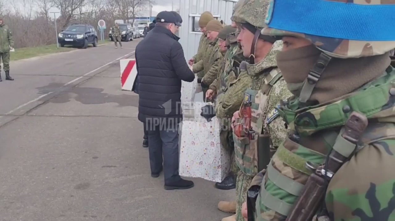 Представители ОКК поздравляют миротворцев с наступающим Новым годом. Объехали все посты, привезли подарки.