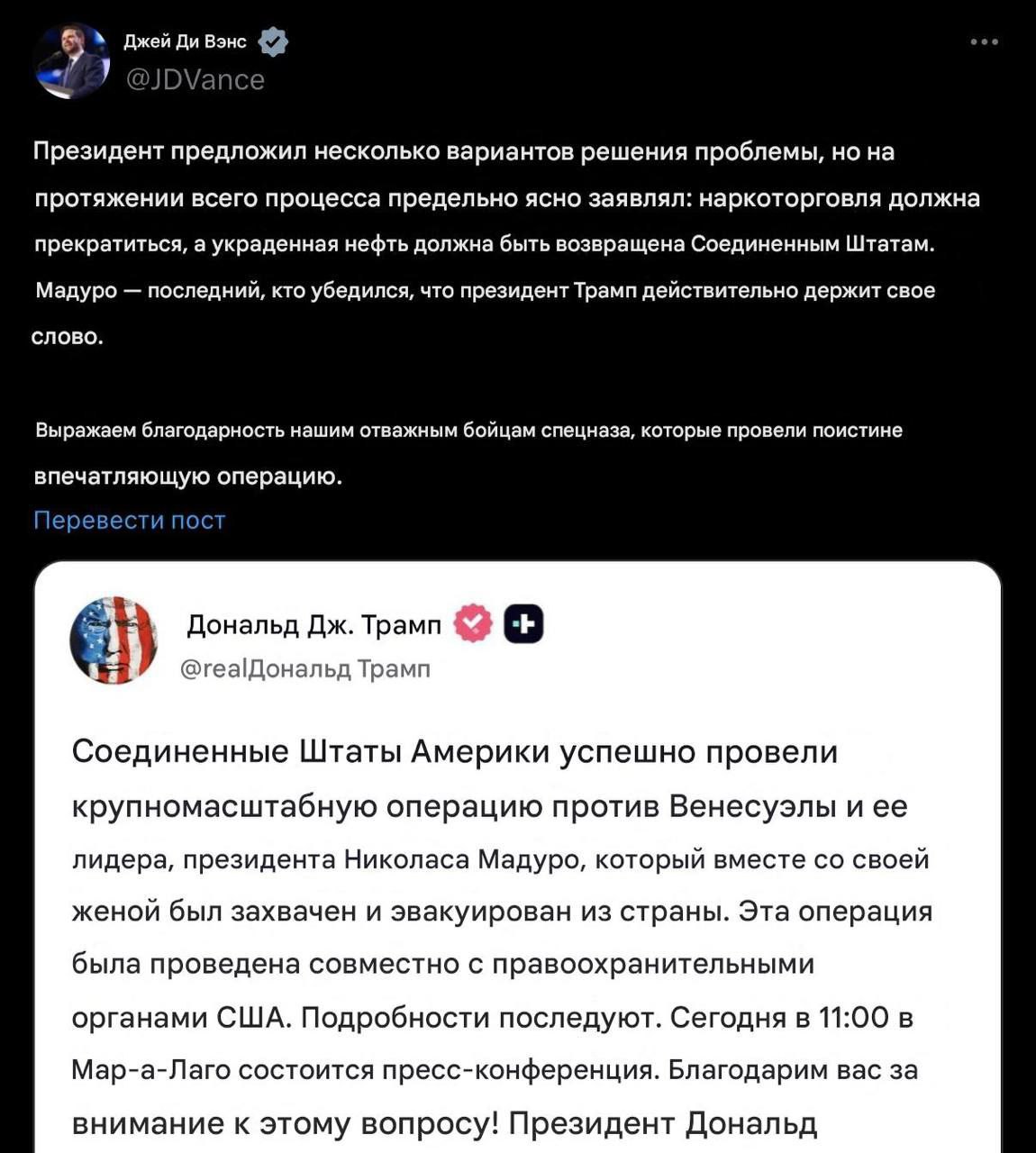 Трамп неоднократно предлагал Венесуэле послабления в обмен на приостановку наркотрафика и возвращение «украденной» Каракасом нефти, — вице-президент США Вэнс.