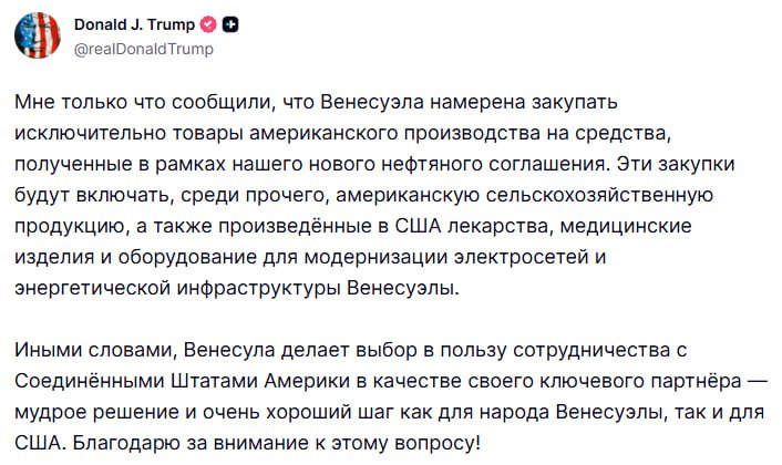 Венесуэла будет покупать только продукцию США на средства, которые выручит от сделки по продаже нефти, — Трамп.
