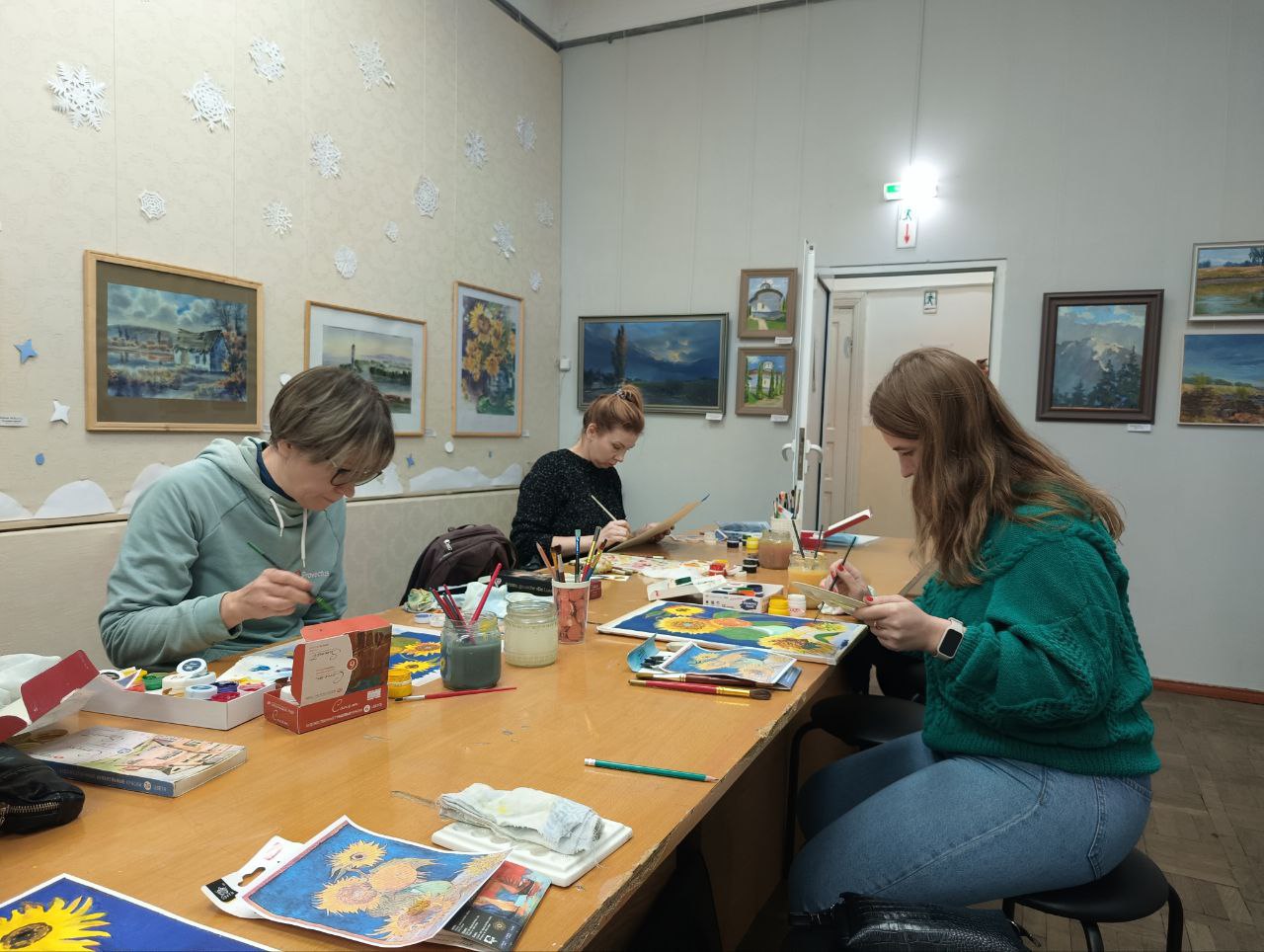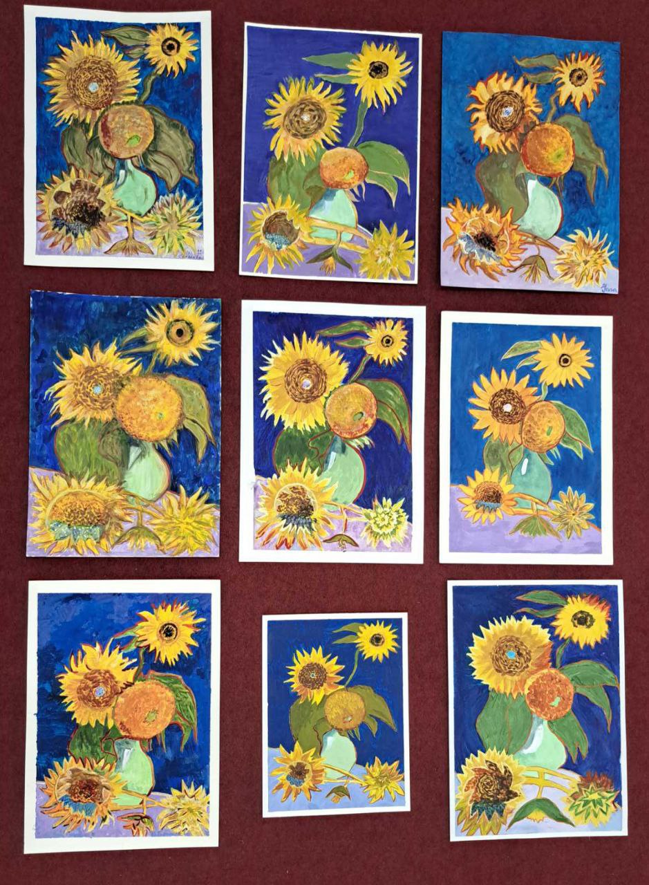 Взрослые, уже исчерпав зимние и праздничные сюжеты в прошлом году, вновь взялись за освоение новых техник и стилей. Вчера и сегодня художники-любители утверждались в своих навыках и рисовали подсолнухи, подражая знаменитому Ван Гогу, что помогло им раскрыть свои творческие возможности и расширить художественный опыт.