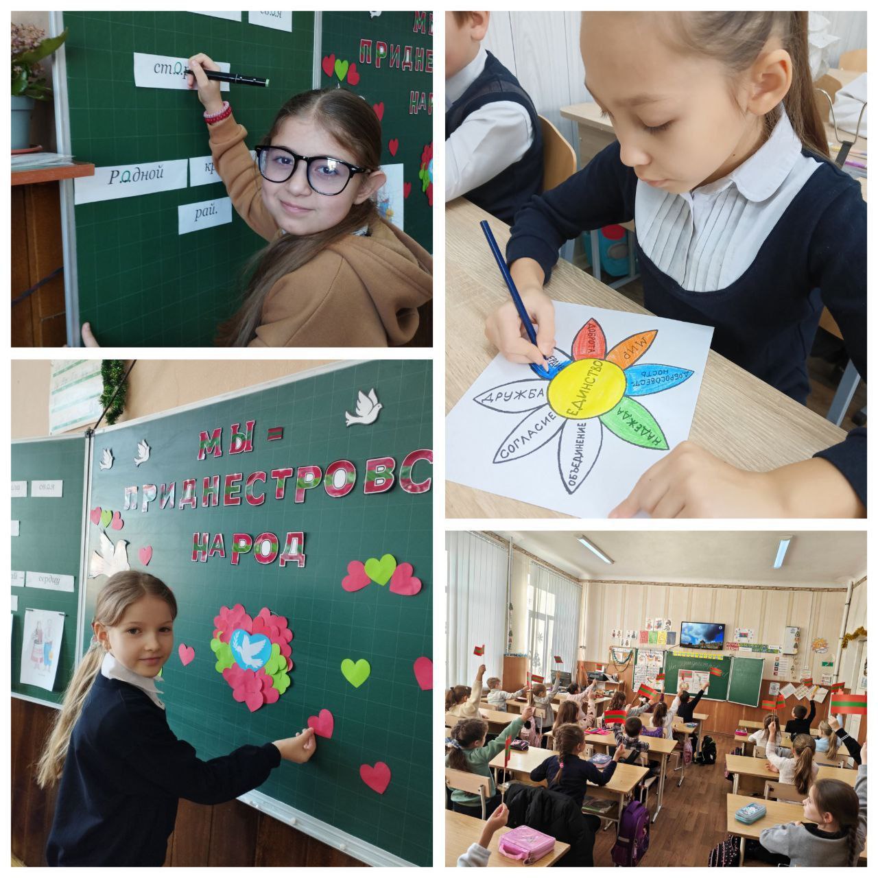 Здесь прошёл единый классный час, посвящённый Году приднестровского народа. Школьникам рассказали об истории создания республики, государственных символах и культурных особенностях Приднестровья.