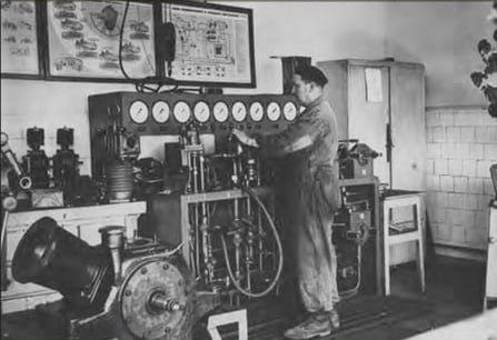 Павел Григорьевич Змеу на своем рабочем месте испытывает стенд тормозных приборов локомотивного депо им. Старого.