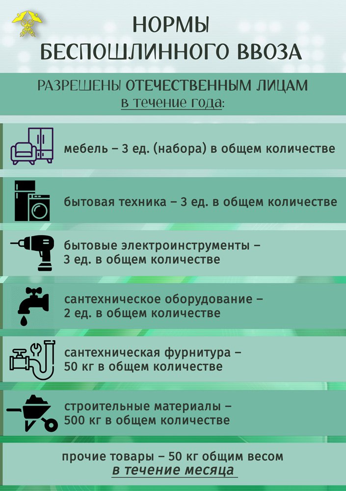 выделены товары, которые в пределах установленных норм беспошлинного ввоза могут перемещаться только отечественными физическими лицами (это, например, строительные материалы, мебель, бытовая техника, сантехническое оборудование, малые с/х или садовые машины).