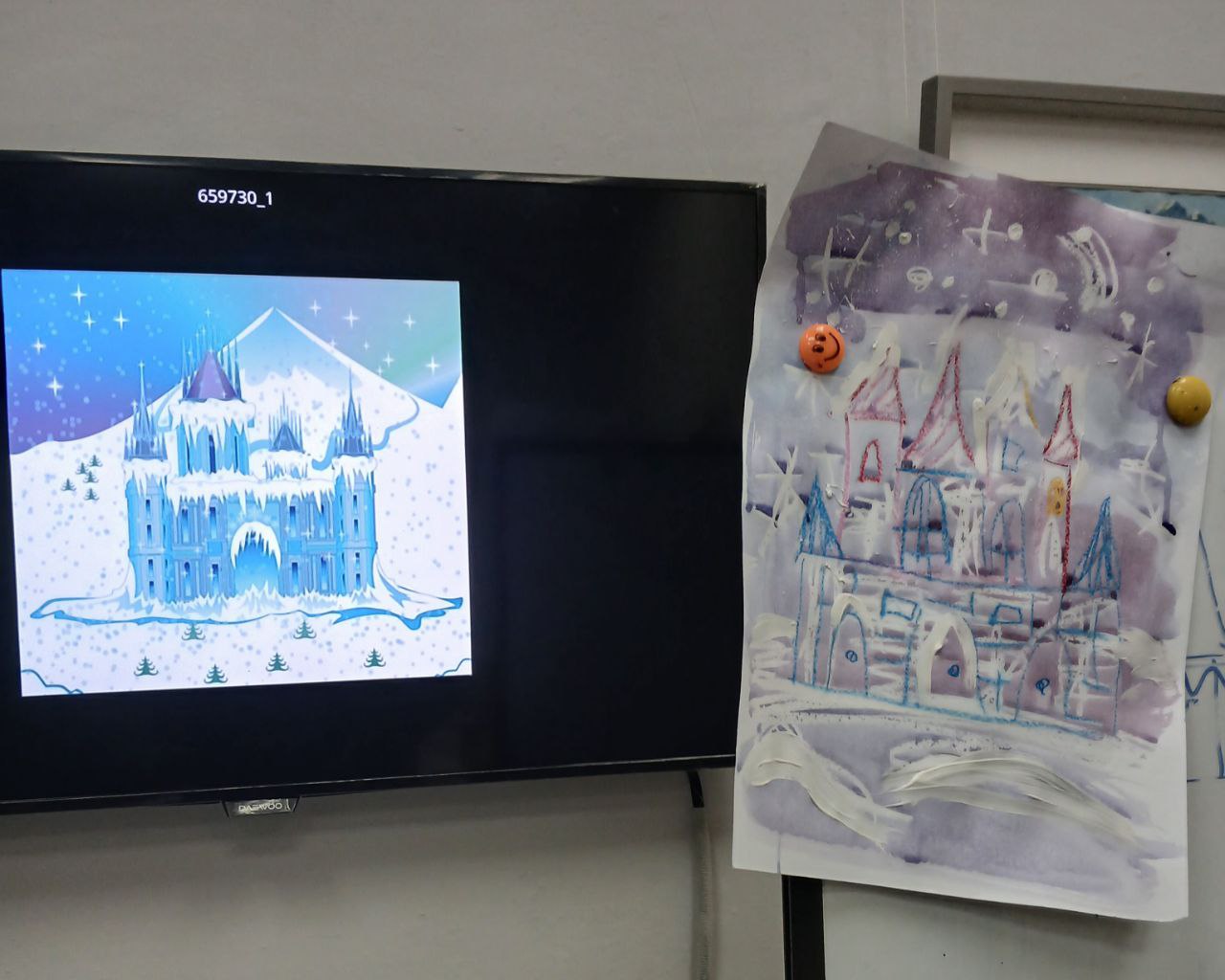 Теперь ребята знакомились со сказкой "Снежная королева" и рисовали снежный замок с помощью двух техник - пастели и акварели. А затем с удовольствием, от души, применяя твёрдые кисти, "посыпали" рисунки белой гуашью: получался снег, как настоящий! На следующем занятии дети будут рисовать другую зимнюю сказку - "Двенадцать месяцев".