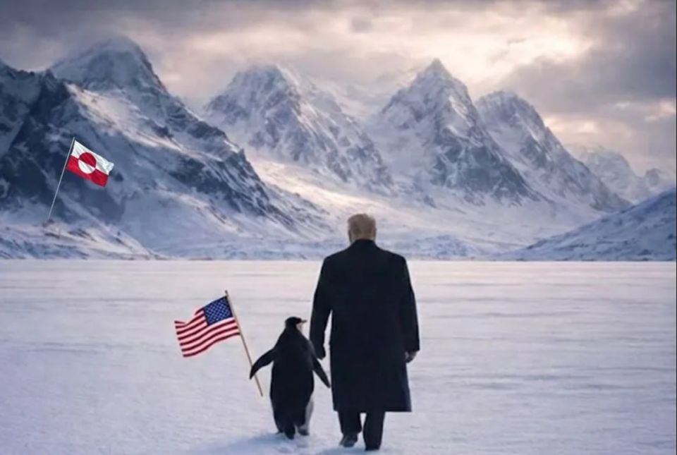 Белый дом опубликовал ИИ-фото президента США, разгуливающего по Гренландии под руку с пингвином (хоть пингвины в Гренландии и не водятся).