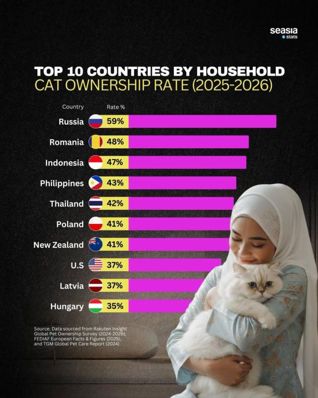 В России больше всех в мире любят кошек – здесь самая большая доля владельцев котов в мире, исследование компании Dalia Research.