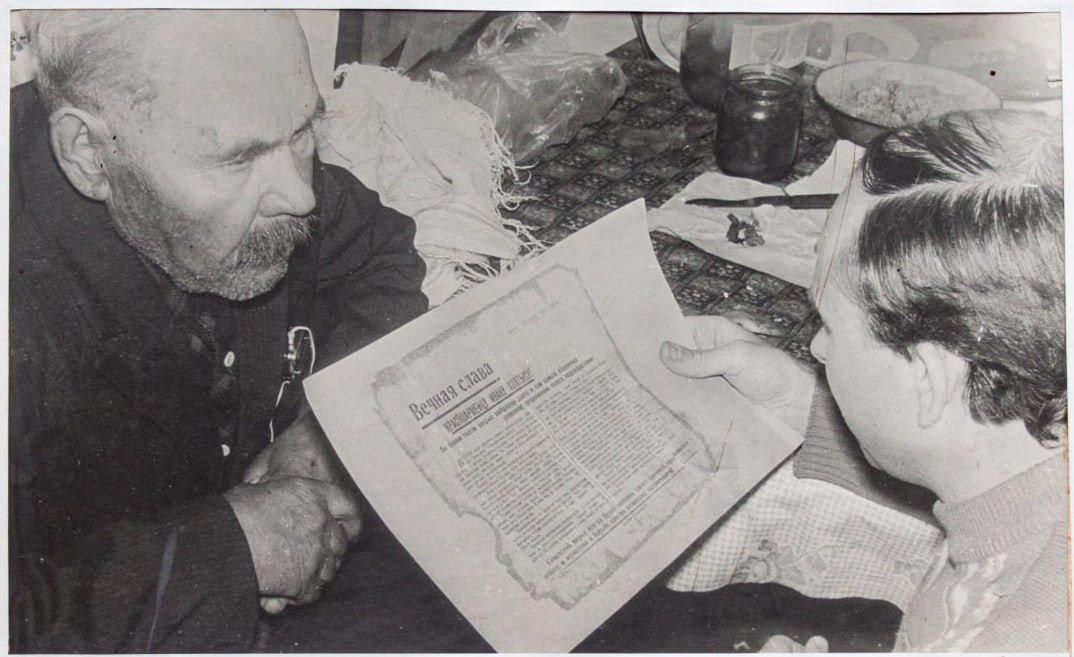 Отец Героя Советского Союза Ивана Солтыса – Сидор Артёмович – за чтением листовки, посвящённой подвигу сына