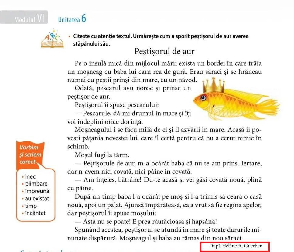 В молдавском учебнике по румынскому для второклашек «Сказку о рыбаке и рыбке» подписали именем Хелены Гербер — писательницы из США, родившейся в 1859 году