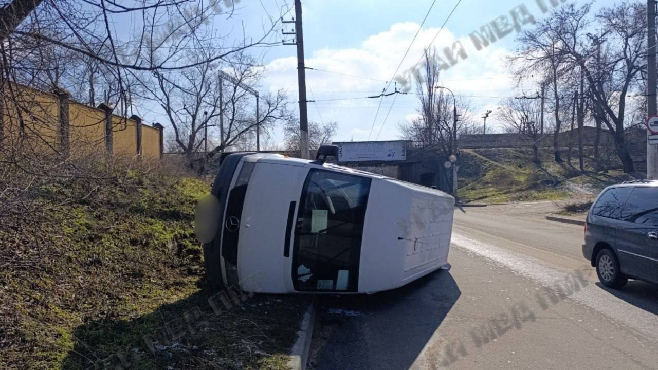 В Тирасполе на улице Щорса микроавтобус «Мерседес» перевернулся на бок