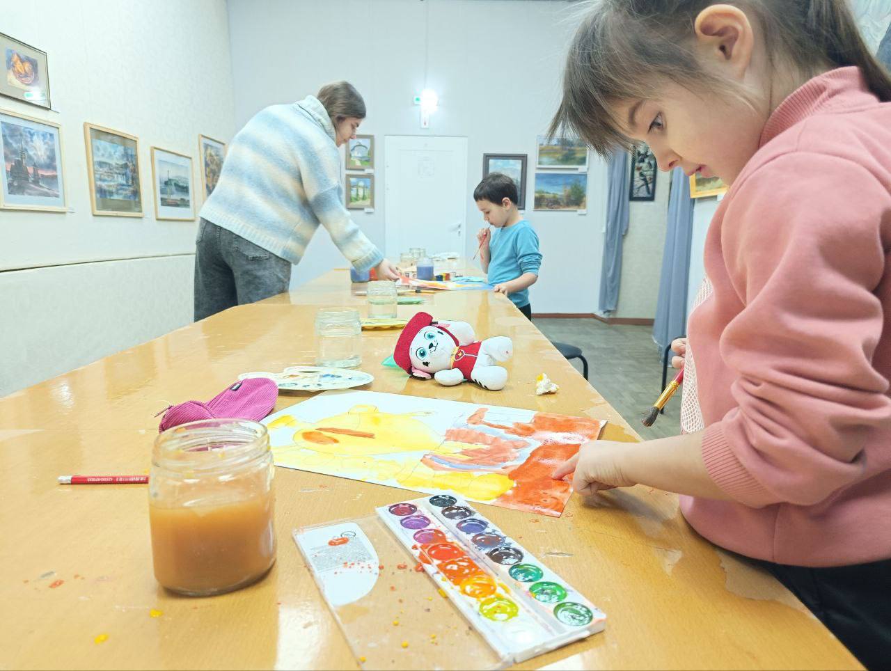 Маленькие художники изобразили самовар с блинами и бубликами, передавая атмосферу сыропустной недели через яркие, сочные краски.