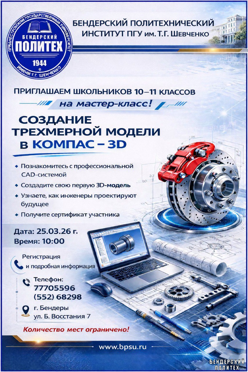Бендерский политехнический институт ГОУ «ПГУ им. Т.Г. Шевченко» приглашает школьников 10-11 классов принять участие в мастер-классе «Создание трёхмерной модели в Компас-3D».