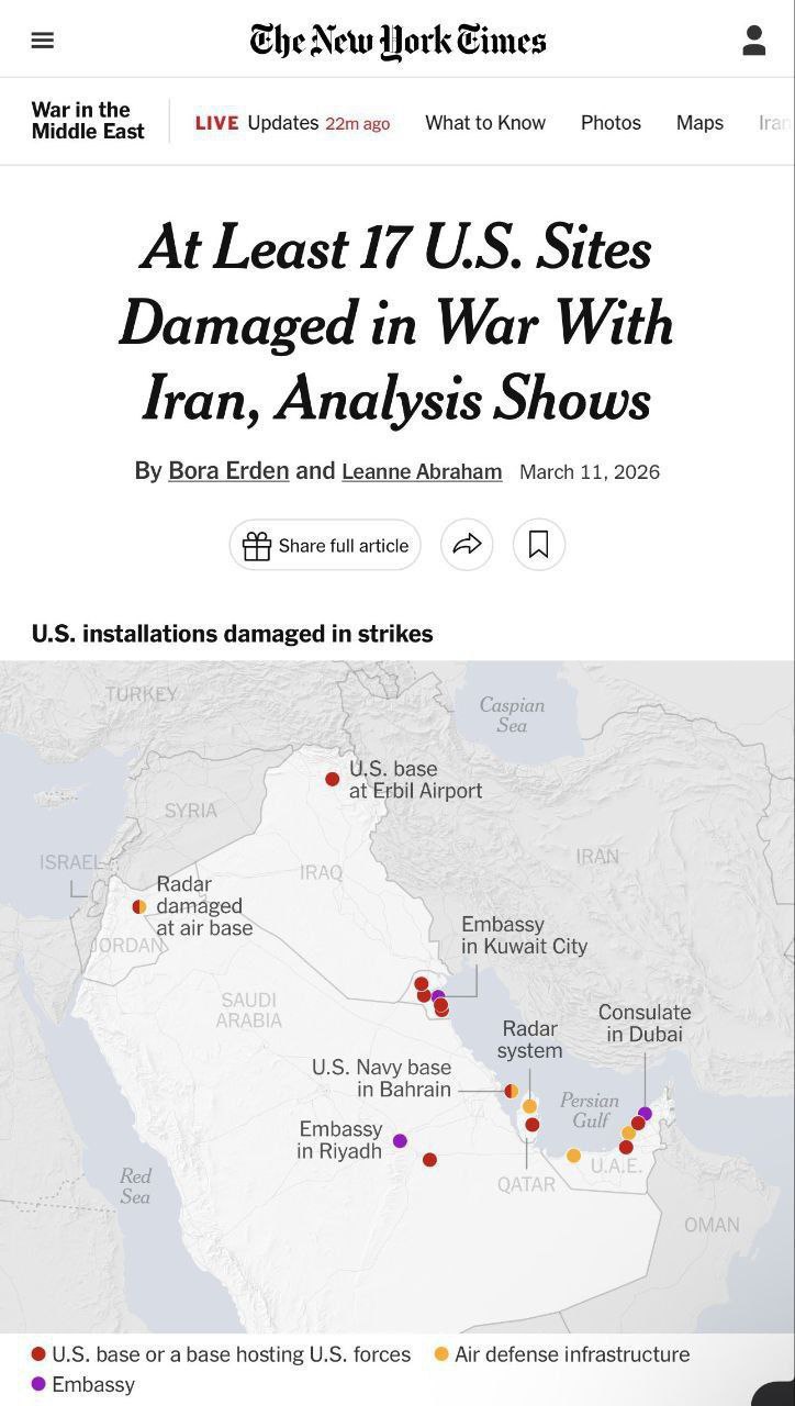 17 военных объектов США атакованных Ираном с начала войны. Ударам подверглись практически все крупнейшие американские базы в регионе. Так по ним еще не бил никто и никогда.