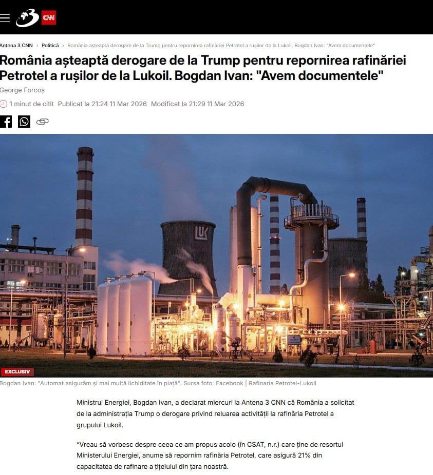 Румыния просит у Трампа дать разрешение на запуск нефтеперерабатывающего завода «Petrotel» российской компании «Лукойл». Завод может обеспечить около 21% мощностей по переработке нефти в Румынии.