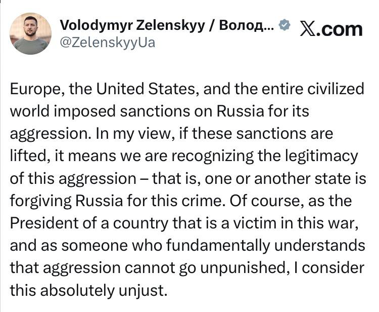 Европа, Соединенные Штаты и весь цивилизованный мир ввели санкции против России за ее агрессию. На мой взгляд, если эти санкции будут сняты, это будет означать признание легитимности этой агрессии - то есть, то или иное государство прощает России это преступление. Конечно, как президент страны, ставшей жертвой этой войны, и как человек, который в корне понимает, что агрессия не может остаться безнаказанной, я считаю это абсолютно несправедливым.