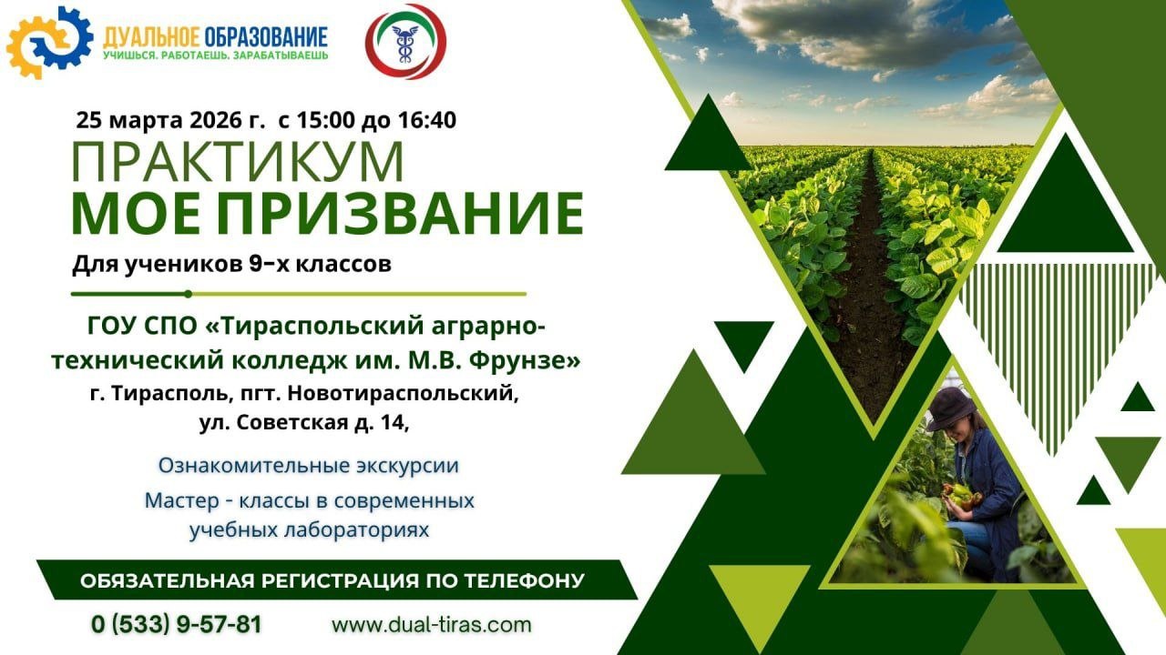 25 марта (15:00-16:40) Тираспольский аграрно-технический колледж им. М. В. Фрунзе – мастер-классы по специальностям «Агрономия» и «Мехатроника в отрасли сельского хозяйства».