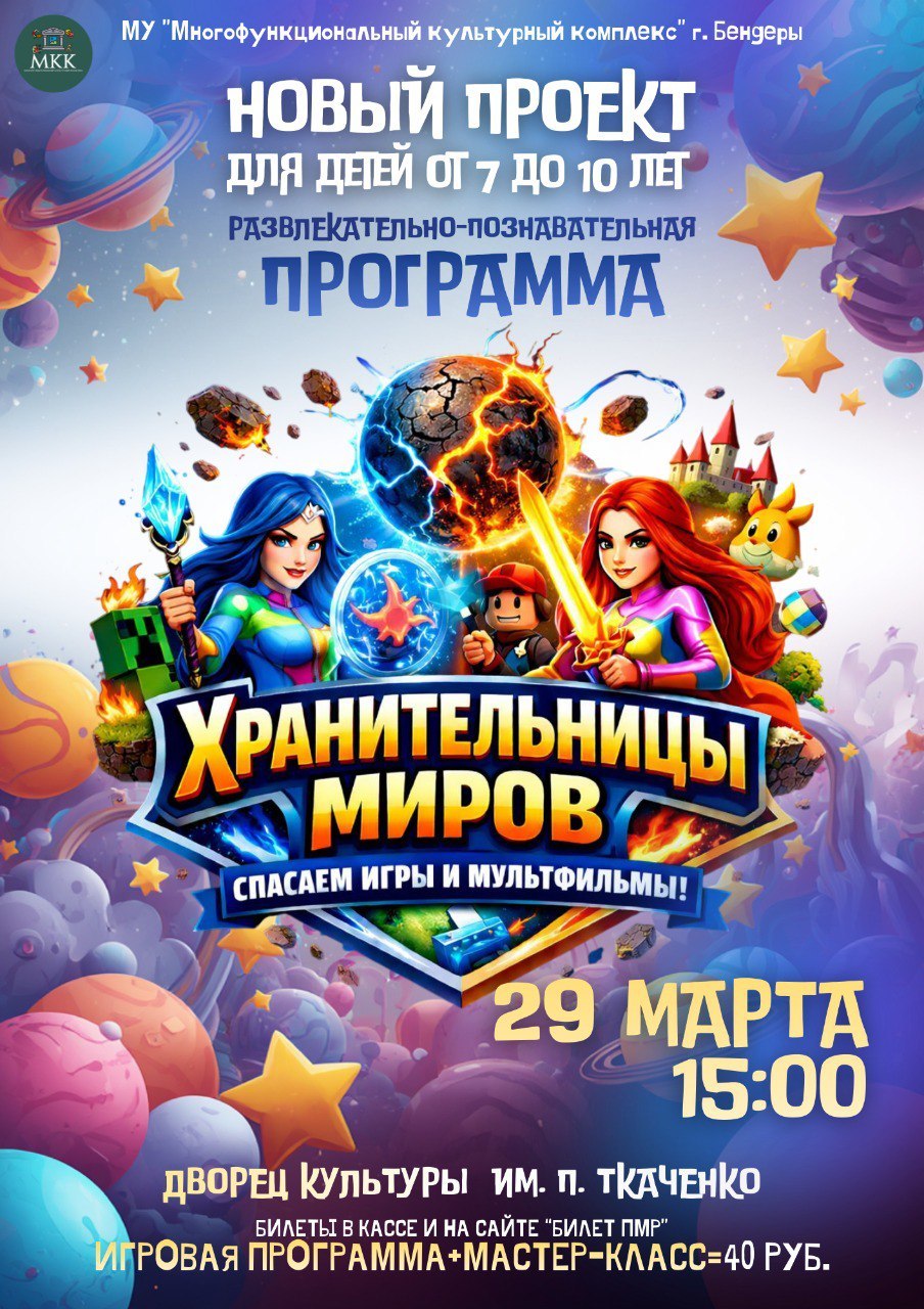 ДК им. П. Ткаченко. 29 марта. 15:00. 40 руб. (Игровая программа + Мастер-класс). Билеты уже в продаже в кассе ДК и на сайте «Билет ПМР».