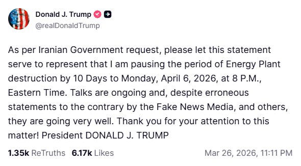 В соответствии с просьбой иранского правительства настоящим заявляю, что я приостанавливаю процесс уничтожения объектов энергетической инфраструктуры на 10 дней до понедельника, 6 апреля 2026 года, 20:00 по восточному времени [7 апреля 03:00 по мск]. Переговоры продолжаются и, несмотря на ложные заявления об обратном со стороны СМИ, распространяющих фейковые новости, и прочих, идут очень успешно.