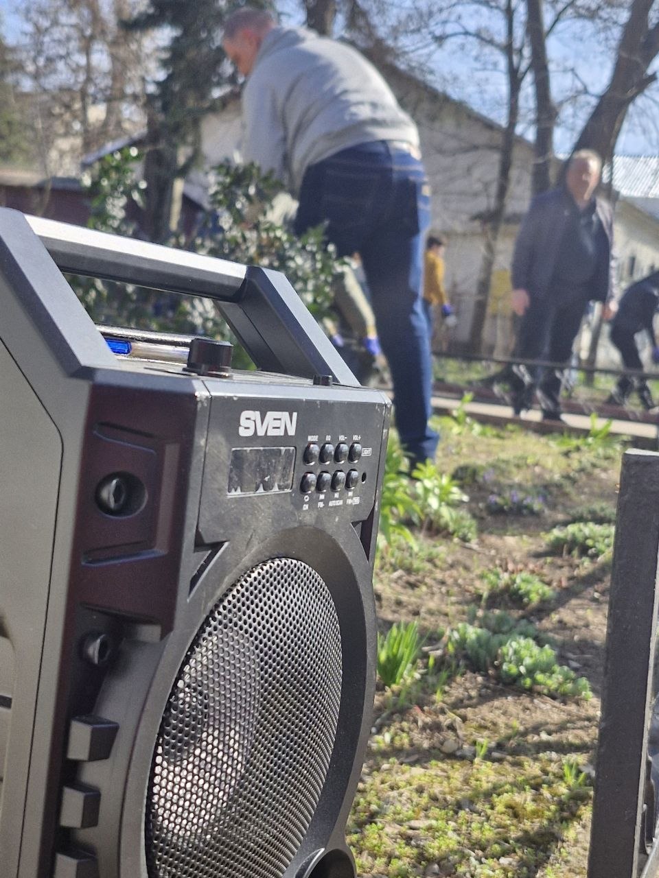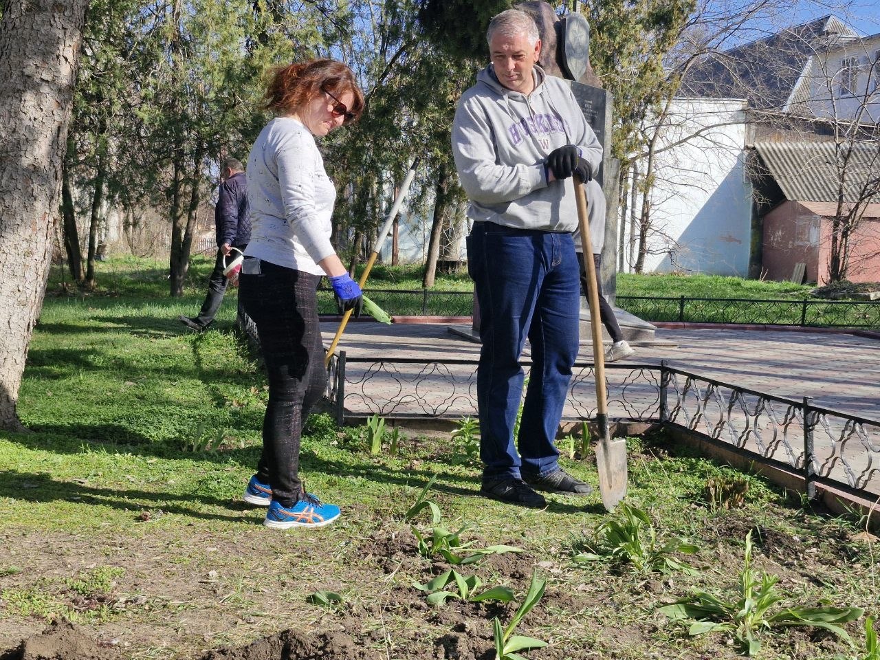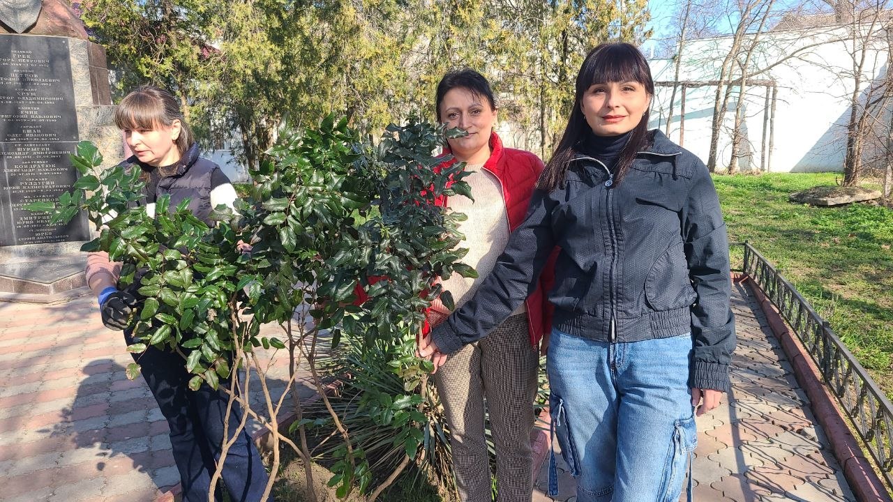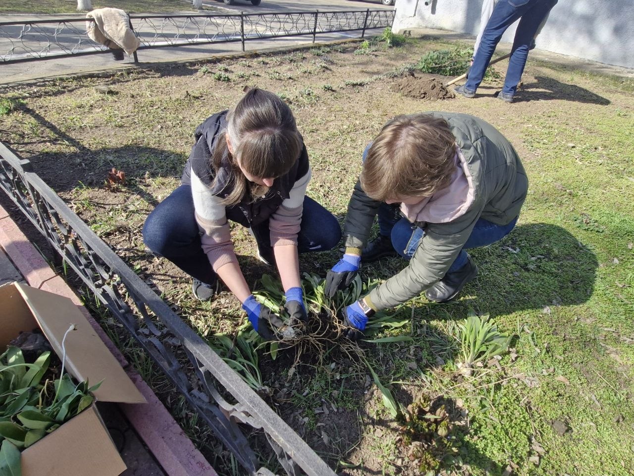 Здесь обновили клумбы и высадили около ста цветов — тюльпаны, нарциссы, лилии, ирисы и даже магонию падуболистную. Работали слаженно и с настроением — в итоге территория заметно преобразилась.