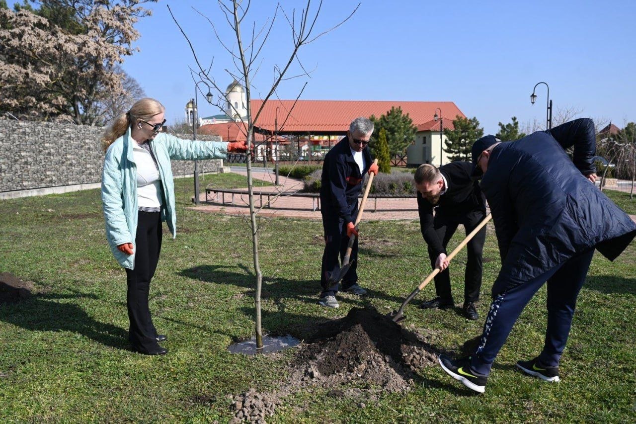Вместе с Вадимом Красносельским деревья сажали Игорь Смирнов, Виталий Нягу и настоятель храма Святого благоверного князя Александра Невского отец Михаил.