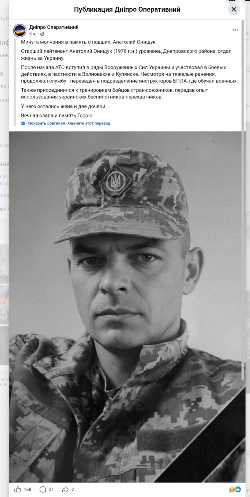 Украинские паблики опубликовали некролог на старшего лейтенанта ВСУ Анатолия Онищука, который занимался "подготовкой военнослужащих стран-союзников по применению украинских дронов-перехватчиков".