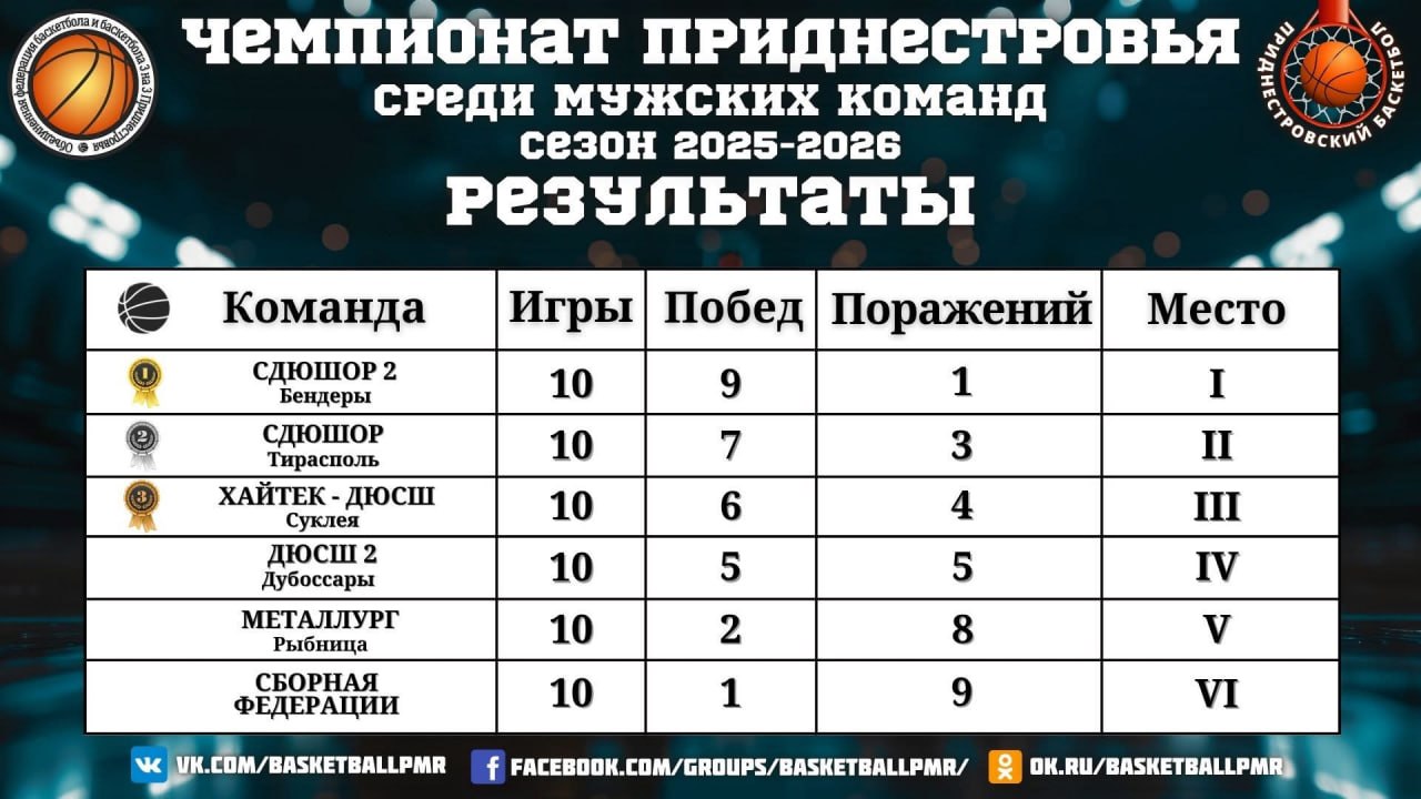 2 апреля завершился XI Чемпионат Приднестровской Молдавской Республики по баскетболу среди мужских команд. В соревнованиях приняли участие 6 сильнейших команд республики, которые на протяжении двух кругов – с ноября 2025 по апрель 2026 года – боролись за победу.
