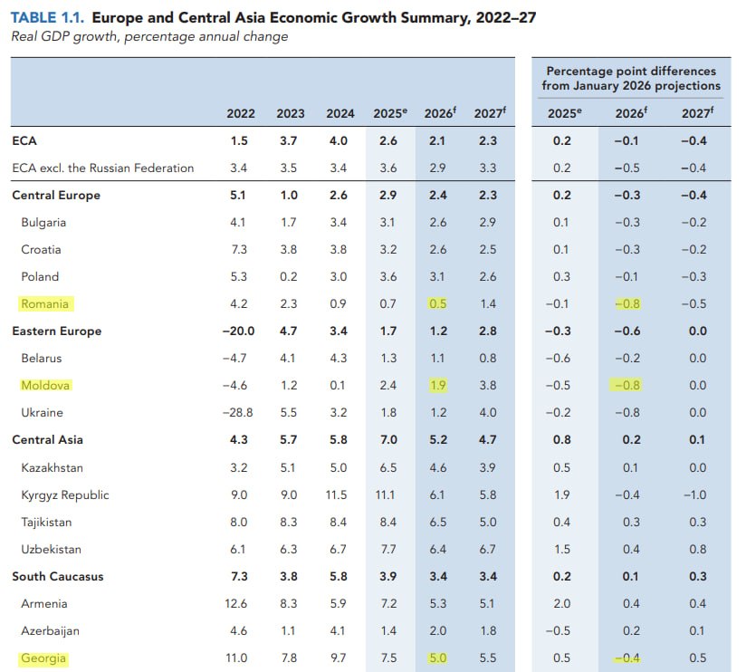 Согласно обновлённому прогнозу, Молдова покажет в текущем году рост в 1,9% (-0,8 п.п. по сравнению с январским прогнозом), а Румыния и вовсе 0,5% (-0,8 п.п.).