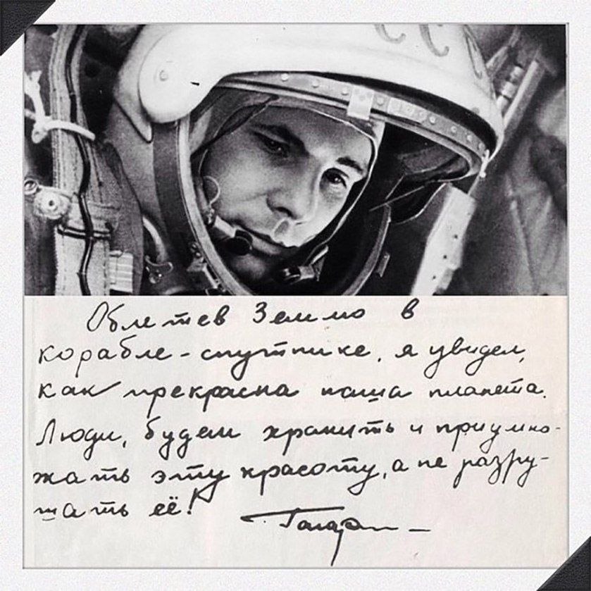 «Облетев Землю в корабле-спутнике, я увидел, как прекрасна наша планета. Люди, будем хранить и приумножать эту красоту, а не разрушать её!» — Гагарин