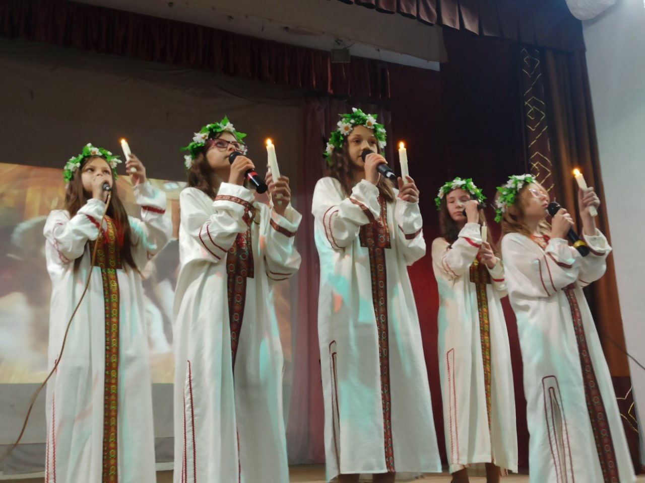 На сцене ДДЮТ школьники и воспитанники детских садов поют песни и читают стихи. Также организована выставка.