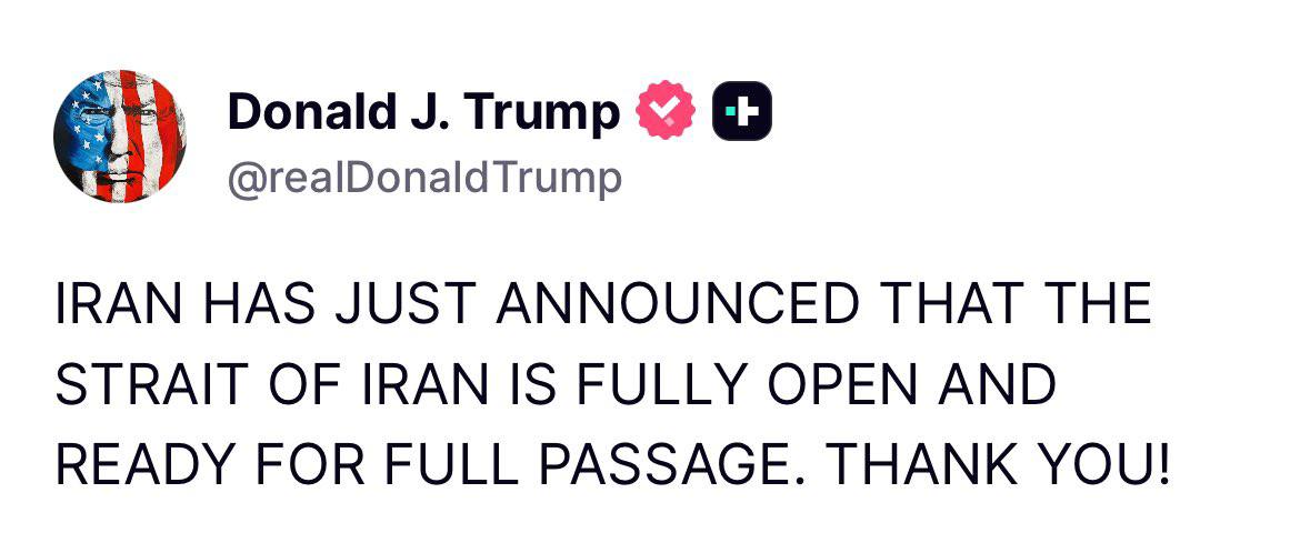Иран только что объявил, что Иранский пролив полностью открыт и готов к полному проходу. Спасибо!