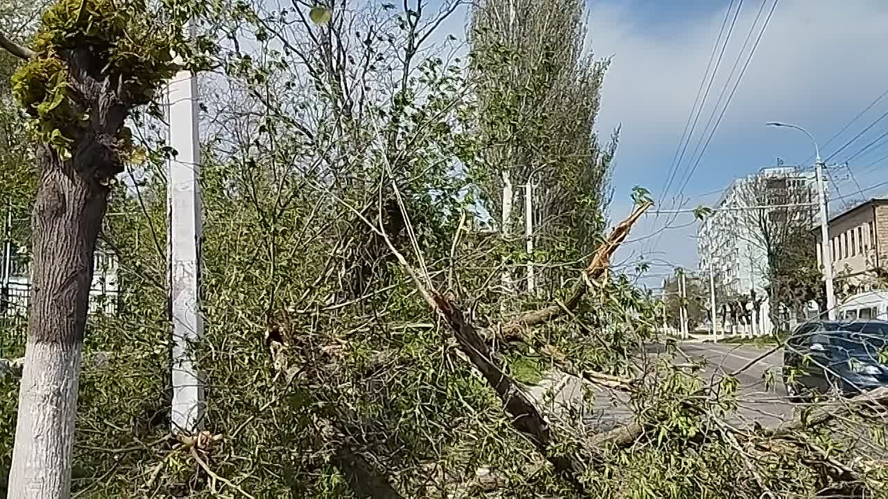 Упавшее дерево на ул. Суворова, в районе теоретического лицея, оборвало провода. Часть домов осталась без света. Последствия ураганного ветра будут серьезными!
