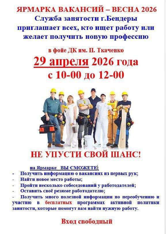 Завтра в Бендерском ДК им. П. Ткаченко пройдут ярмарки вакансий и профессий