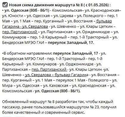 Госадминистрация Тирасполя опубликовала новые схемы движения городских маршруток. Изменения вступят в силу с 1 мая и касаются рейсов № 8, 9А, 10 и 12.