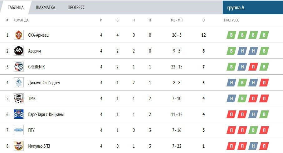 После четырех туров зимнего турнира по футболу «Ярна» в группе А лидером остается СКА-Армеец, который в матче против главного конкурента - «Динамо-Слободзея» одержал уверенную победу со счетом 5:1. Этим воспользовался «Аварим», обыгравший ТМК (3:0) и вышедший на второе место. В группе Б в единоличные лидеры выбрался дубль «Динамо-Слободзеи», которому присуждена техническая победа над «SINAI» (3:0).