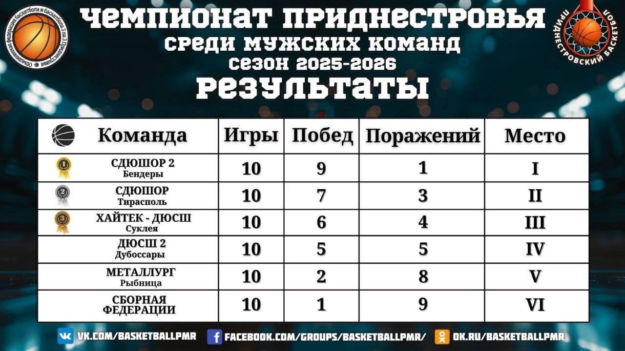 По итогам двух кругов чемпионата первое место заняла команда СДЮШОР №2 города Бендеры, второе место - СДЮШОР №1 Тирасполь, а третье - команда Хайтек-Суклейская ДЮСШ.